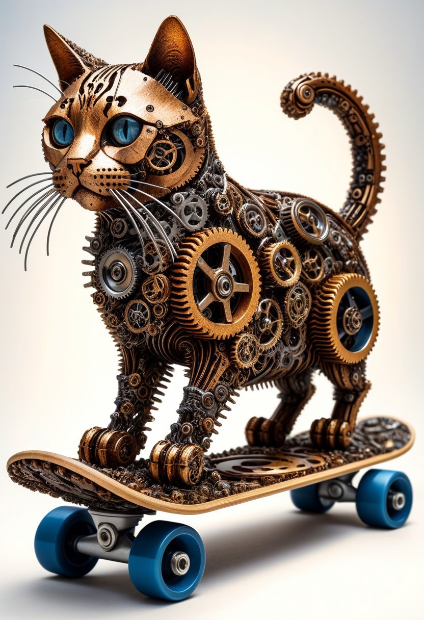 An epic photo of a cat made of roast gears, on a skateboard, masterpiece, best quality, highly detailed, sharp focus, dynamic lighting,