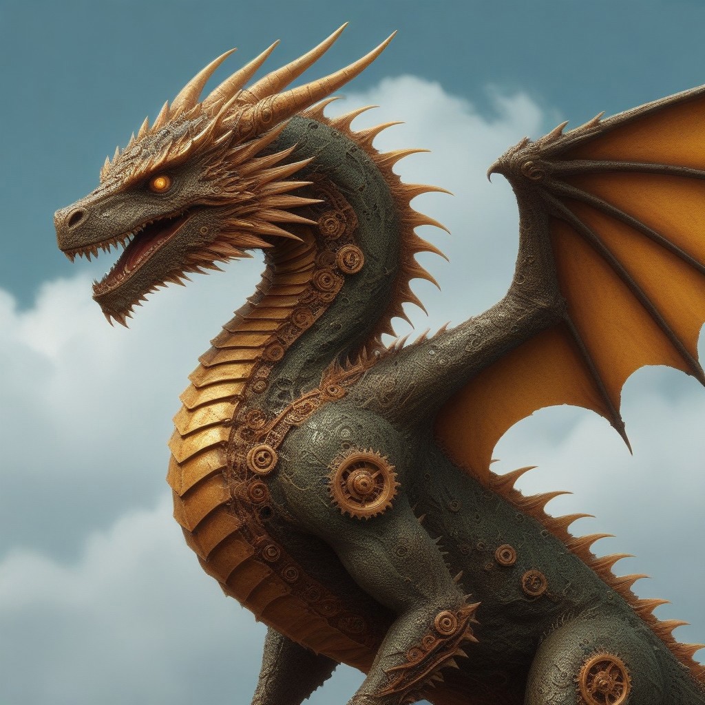 digital art images, beautiful, fantasy, and complex, detailed portrait , clockwork Eastern_dragon made of gears, cyber-like style Flying in the sky, roar:1.4, wings spread wide, , fiery colors, deep green, electric yellow, molten golden edges, beautiful, closeup shot, flash,bolt sea, day time, cloudy, masterpiece, photorealistic, highly detailed,