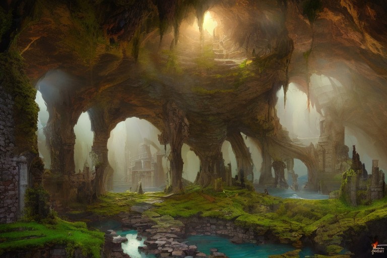 (masterpiece:1.2), (best quality,:1.2), 8k, HDR, ultra detailed, ((photorealistic)), professional light, cinematic lighting, fashion photography, ambient lighting, a huge underground cavern with a big lake and an island in the middle, some ruins on the island, mossy, light through a hole in the ceiling, FanUn, <lora:FantasyUnderground-10:1>, <lora:detail_slider_v4:3>, Style-SwampMagic, epiCPhoto
