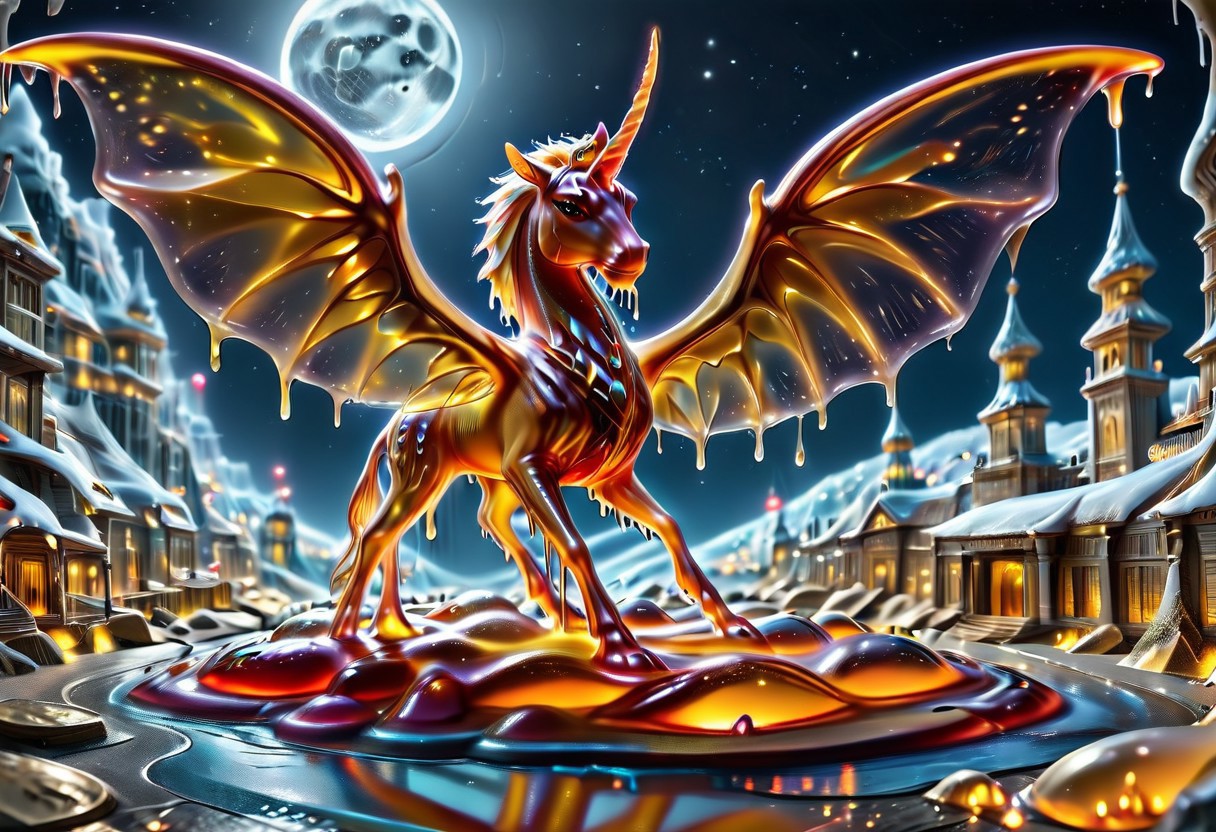 sl1m3d,slime-morph digital art images, beautiful, fantasy, and complex, detailed portrait , a unicorn made out of slime Flying in the sky, flying:1.4, wings spread wide, fiery colors, deep white, electric black, molten golden edges, beautiful, closeup shot, snow, city, day time, moon, masterpiece, photorealistic, highly detailed,
