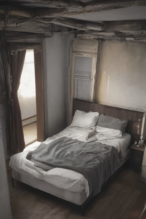 broken bed mattress, basement, blanket, boxes, depressing, chains, table, low light, solid metal door, scary, neat,