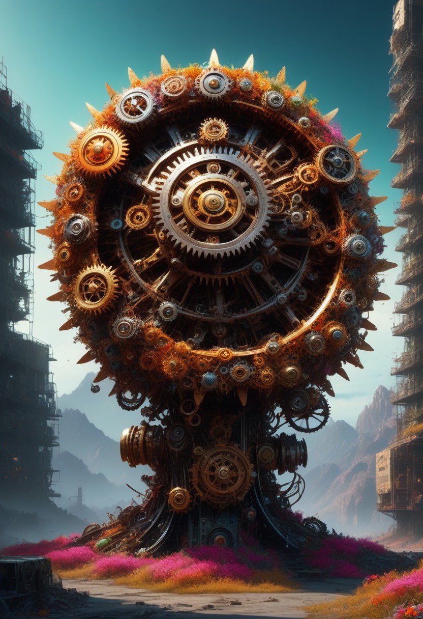 Shiny gear Morph, Shiny gear Morph, Shiny gear , Shiny gear morph Chaos, Masterpiece, best quality, highres, absurdres, photorealistic, cinematic lighting, concept art, Octane Render, Unreal Engine 5. A dystopian Shiny gear apocalypse, where a colossal, vibrant smiley toon flower made of Shiny gears looms over the end of the world. The environment is ultra-detailed, with vibrant colors and dramatic lighting highlighting the surreal, decaying landscape made of Shiny gear pieces. No humans, only the flower's eerie glow illuminating the scene. Cinematic, 3D-rendered, and hyper-realistic, blending absurdity with photorealistic beauty.