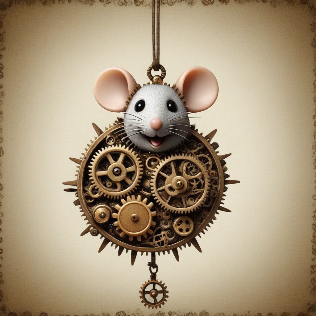 small mouse hanging, gears, gogs, clockwork, gearstyle background