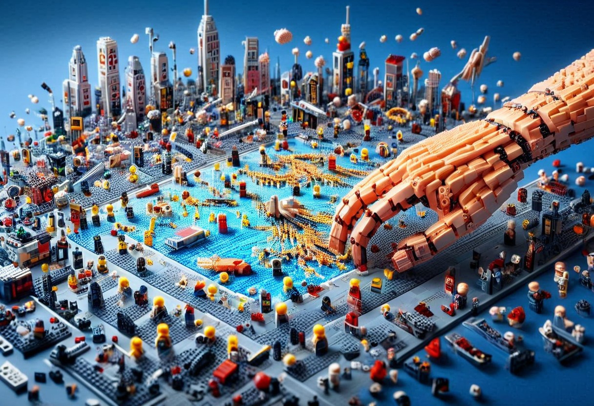 .Human hand with skin texture, hits the table destroying a miniature Lego city, many Lego men injured and dismembered