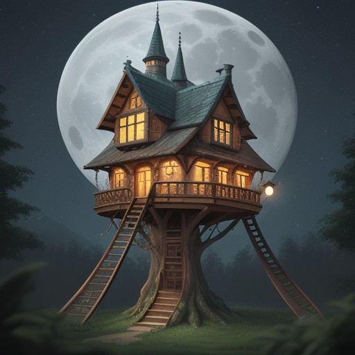 a close-up photo of the Isometric_Dreams, a tree house with a tower and a staircase inside of it, surrounded by trees and a moon in the sky