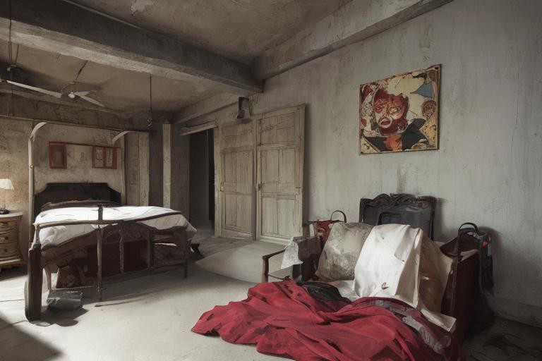 large dirty bed, basement, blanket, kidnapper room, depressing, table, low light, scary, large metal door,
