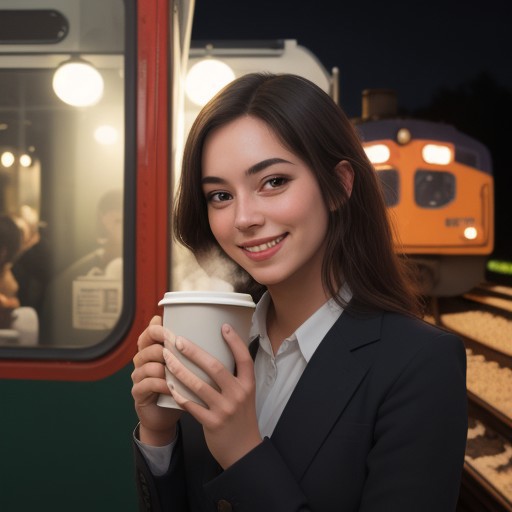 Portrait,girl,on top of a train, drinking coffee, smiling, detailed,night time