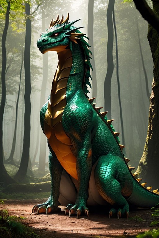 a majestic dragon standing in a sunlit enchanted forest. The dragon has a powerful, muscular body covered in sleek black scales with glowing orange cracks, resembling molten lava. A mane of golden fur runs along its neck and chest, giving it a regal, mystical presence. Its eyes glow with an intense fiery light, and its wings, large and bat-like, shimmer with a translucent golden hue as sunlight filters through them. The dragon's sharp, curved horns and leaf-shaped emerald green ear fins add an exotic touch. The forest setting is filled with tall ancient trees, soft green ferns, and dappled sunlight casting a warm glow on the ground. Dust particles float in the air, enhancing the magical atmosphere. The dragon stands confidently, its gaze fierce yet wise, as if guarding a hidden secret deep within the forest.