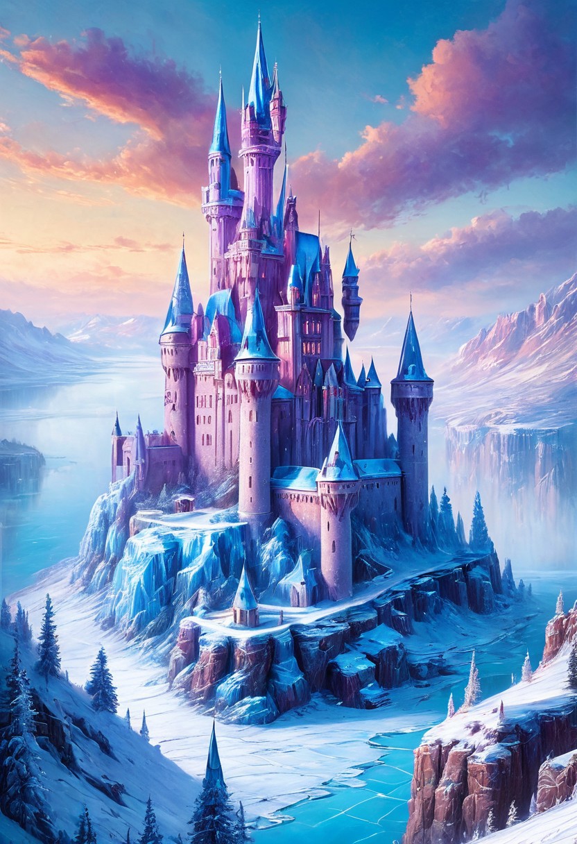 a vast, icy landscape dominated by a grand, frozen castle. The style is highly detailed and realistic, with a focus on the intricate textures of ice and snow. The castle, positioned on the right side, features numerous spires and towers, all covered in thick layers of ice, giving it a majestic yet foreboding appearance. The foreground shows rugged, snow-covered terrain with jagged ice formations leading towards the castle. The sky is overcast with heavy clouds, casting a cold, bluish hue over the entire scene, enhancing the wintry atmosphere. There are no people or text present in the image, allowing the viewer to focus entirely on the dramatic and desolate frozen landscape.charturnerv2, view,made of sparkling amethyst crystals,dungeons and dragons