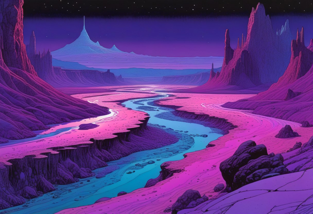 Landscape, Moebius (Jean Giraud) Style page, poison river, dark purple river, luminescent river, night time mountains