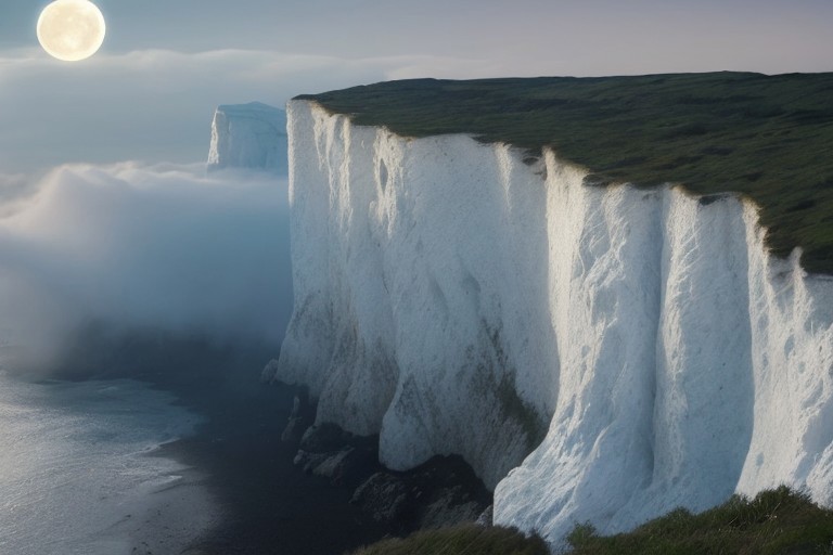 dover cliffside, white cliffs, rolling fog, rock formations, rock terraces, rocky bridge cliffs, rocky protrusions, blue vegetation, at night, bright full moon