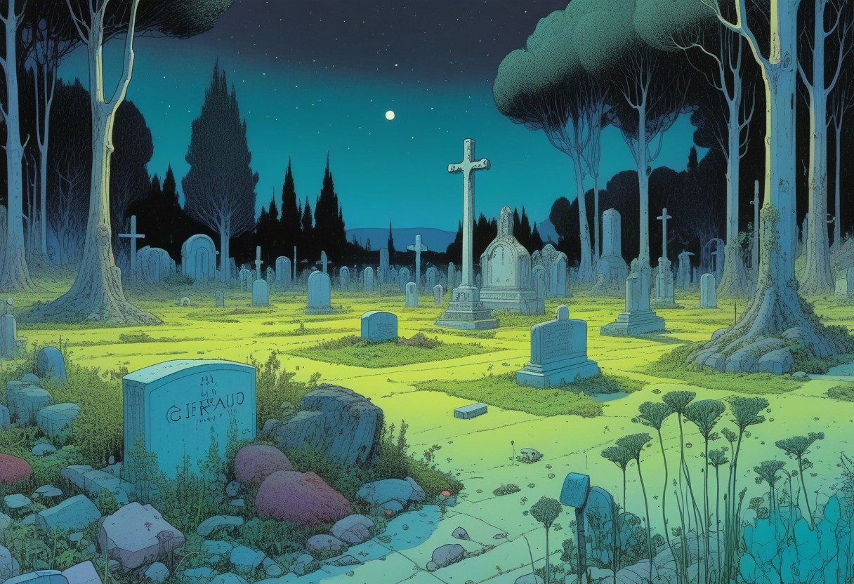 Landscape, Moebius (Jean Giraud) Style page, cemetery, forest, night time, overgrown weeds