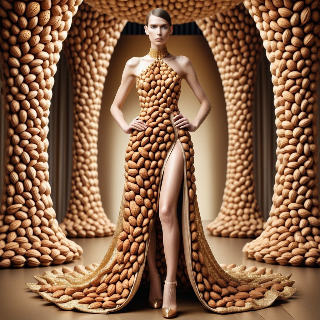 nutstylesnut, almond_dress, nut_fashion, elegant_pose, glowing_golden_fabric, haute_couture, surreal_design, futuristic_fashion, detailed_texture, artistic_fantasy, fashion_show_background