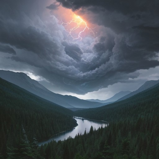 Masterpiece, high-resolution, grainy image, tall mountains, pine forest, multiple floating random glowing orbs, lake, large thunderstorm clouds in the distance