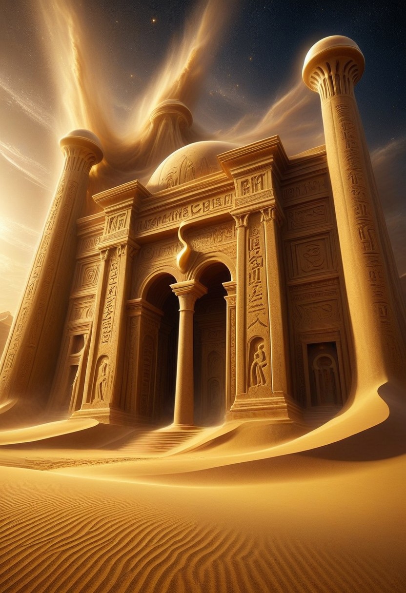 ancient desert temple, carved entirely from flowing golden sand, floating sandstone pillars defying gravity, intricate glowing hieroglyphs shifting across walls, celestial energy pulsating through the structure, desert wind forming ethereal sculptures in the air, sun casting radiant beams through fractured domes, swirling particles creating a mystical atmosphere, hyper-realistic textures, cinematic lighting, ultra-detailed fantasy architecture, otherworldly ambiance