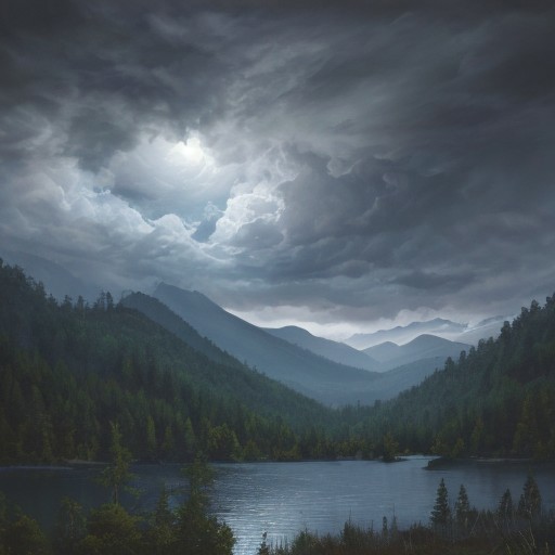 Masterpiece, high-resolution, grainy image, tall mountains, pine forest, multiple floating random glowing orbs, lake, large thunderstorm clouds in the distance