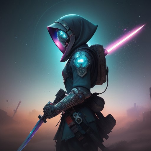A apoclypse surreal cyberpunk setting under a gritty bleaked beige and blue-turqoise misty desert sunset, a Closeup Portrait of an eerie horned hkgod sci-fi shinobi nun-scout with billowing octopus backpack in a sandstorm, their holographic crystalline mask glinting like shattered rainbows. Iridescent black amber teal energy veins pulse across their form. The atmosphere is thick with heat distortion, glowing particles floating in the air. dark atmospheric lighting, white cybernetic armor. Wielding a massive sss great sword with intricate translucent engravings, hknuns