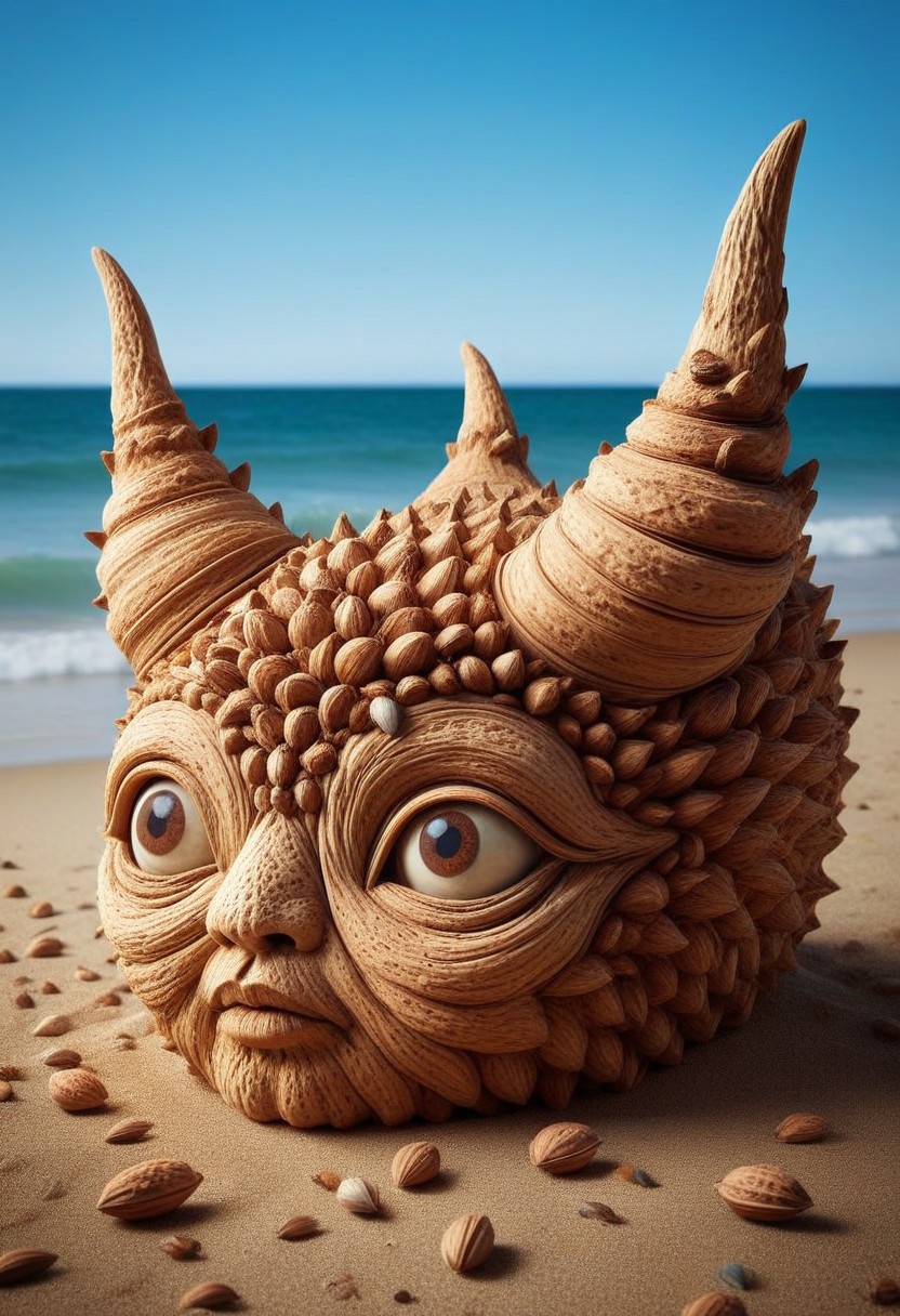 nutstylesnut, A nightmarish sea creature rising from the depths, its massive serpentine bodies sculpted from layers of twisted walnut shells. Each of its seven heads is adorned with jagged hazelnut horns, their eyes glowing like molten pistachios. As it emerges, the ocean churns into a swirling vortex of peanut butter tides, pulling in doomed macadamia ships. Brave warriors in cashew-forged armor launch harpoons tipped with crystallized almond shards, hoping to sever the beast’s immortal heads before it devours the world.