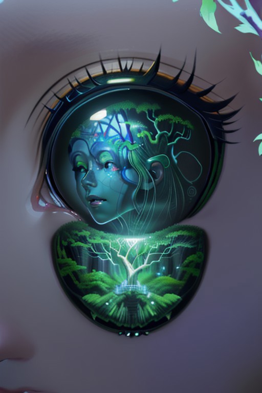 A stunning digital painting of an enigmatic humanoid blending nature and technology. Their face is a pitch-black void, with two glowing eyes piercing through the darkness. Their body fuses biomechanical and botanical elements, with vine-like circuits and metallic sinews forming an intricate, surreal structure. From their head, twisted, ancient tree branches spiral skyward, adorned with lush green foliage, ivy, and fluttering butterflies. The branches extend chaotically yet symmetrically, merging into a misty, dreamlike forest background, creating an ethereal sense of unity between organic and synthetic life. The atmosphere is a fusion of dark fantasy and cyber-organic surrealism, evoking themes of AI merging with nature and the transcendence of life beyond the digital. The ultra-HD artwork features painterly strokes, dynamic lighting, and soft gradients, enhancing the contrast between the warm greens of the vegetation and the cold, mechanical hues of the body. Perfect for fans of dark fantasy, sci-fi, and biomechanical art, this visually striking and thought-provoking piece embodies futuristic mysticism and organic transcendence, making it an unforgettable artwork that captivates the imagination.