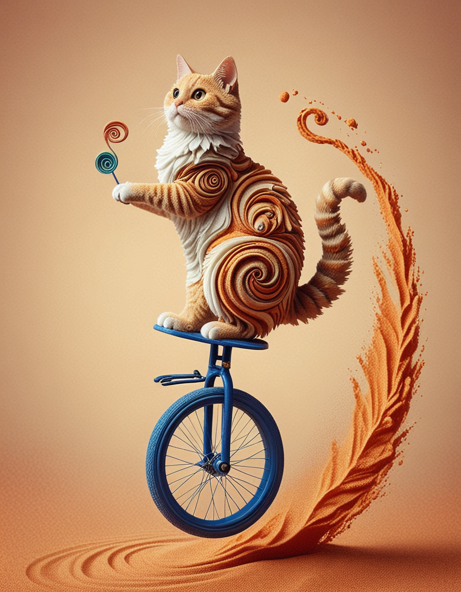 a cat riding a unicycle , sandswirl <lora:SandSwirlLoRa:0.7> <lora:add-detail-xl:1>