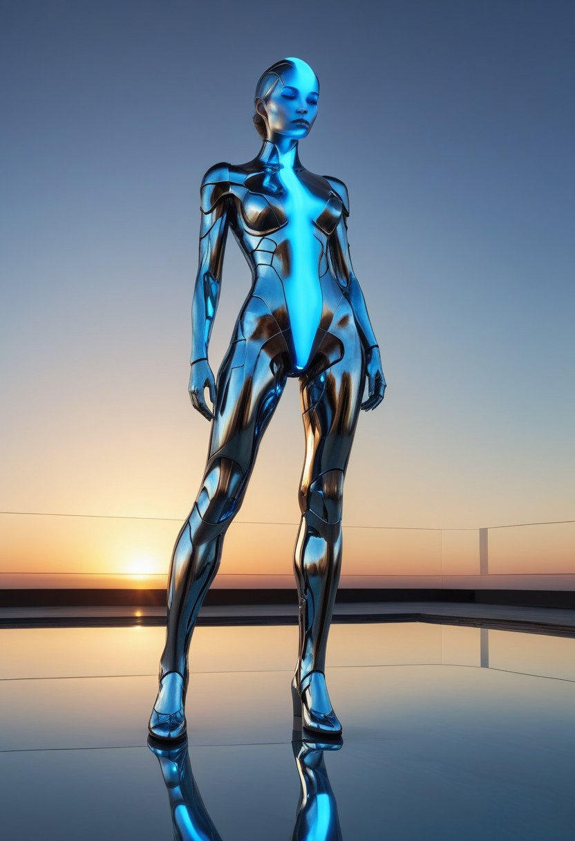 higly detailed, full length photo of a woman, skin made of iron, polished to a hig reflection, retrofuturistic style, the floor is made of polished iron , blue glow eminates from within her body, sunset