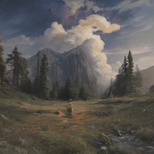 scifi scenery, outdoors, scenery, tree, flower, sky, day, nature, mountain, grass, starry sky, string of flags, landscape, field, fantasy, forest, cloud, 1girl, photorealistic, rainy day, umbrella, <lora:XL-futurism-extraordinaire:1>