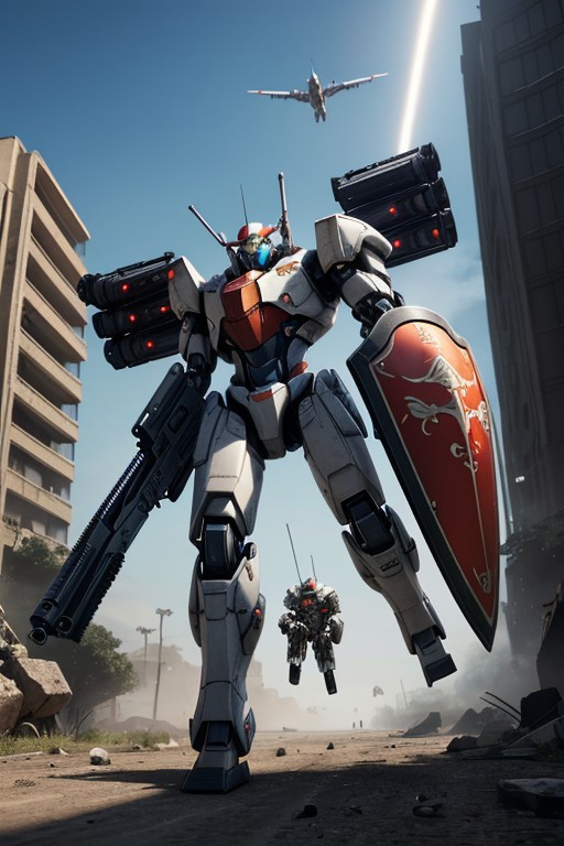 red and white mecha armor, (flying toward the viewer:1.20), armaments equipped in the armor, (right hand holding beam rifle:1.20), destroyed city in the background:0.8, (beam rifle equipment on right hand:1.3), (shield equipment on left hand:1.3), mounted missile pod on shoulder