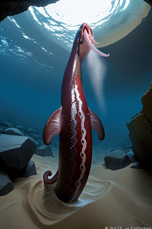 very realistic photo, hdr, of a 10-foot long massive very thick very muscular dark crimson glossy lamprey, very swollen, stands straight up from the sand at the bottom of the deep ocean surrounded by rocks, it has a mouth like a lamprey and a milky slime is squirting out of the mouth, turgid and engorged and it has a long pink tongues, smooth skin