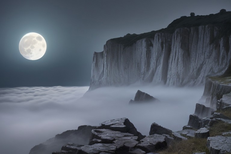 dover cliffside, white cliffs, rolling fog, rock formations, rock terraces, rocky bridge cliffs, rocky protrusions, blue vegetation, at night, bright full moon, misty, foggy, spooky night, fog rolling in from the shore