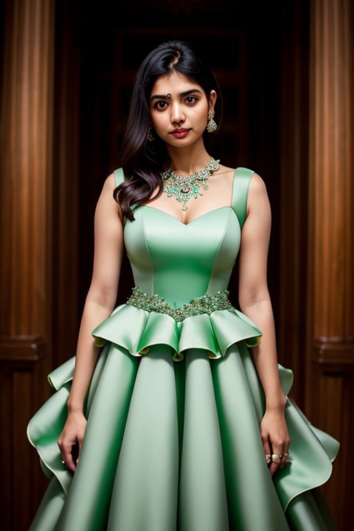 20 year old indian girl, (ball gown dress), ((chocolate mint color long peplum)), pray,