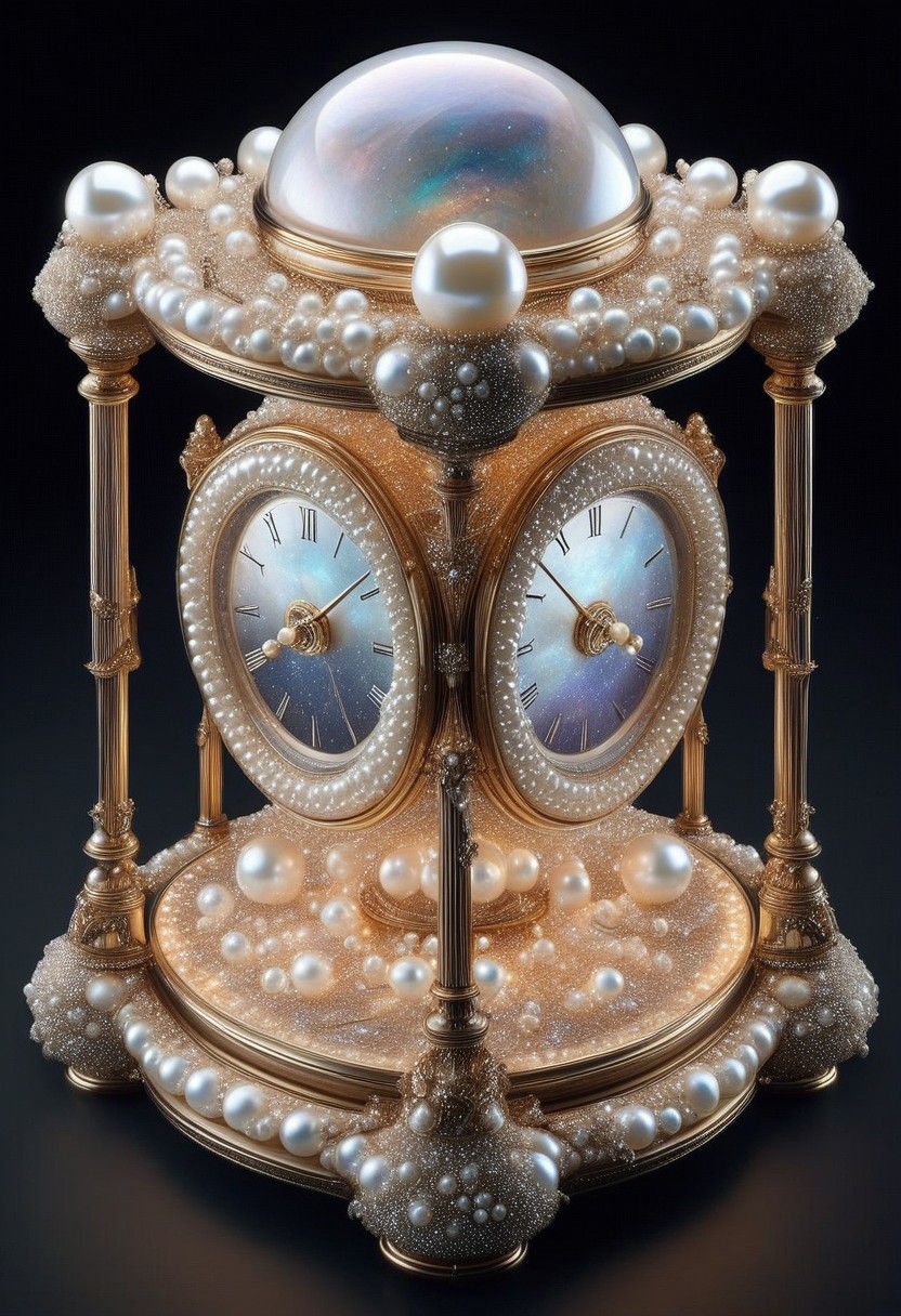 massive celestial clock crafted from layers of mother-of-pearl, delicate cogs and gears shifting with mesmerizing iridescence, suspended in an infinite cosmic void, hands made of crystallized moonlight, softly glowing symbols rotating around the central axis, weightless golden dust swirling around the intricate mechanisms, faint echoes of chimes resonating through the ethereal space, floating pearl spheres orbiting the structure like celestial bodies, ultra-detailed steampunk fantasy design, cinematic lighting, high contrast reflections, surreal mechanical artistry
