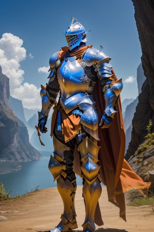 1boy, solo, solo focus, teenage, wear medium armor, orange color armor theme, outdoor, cape, beautiful scenery in the background, fantasy style, knight, armor, helmet, body straight to viewer, front body view, full body