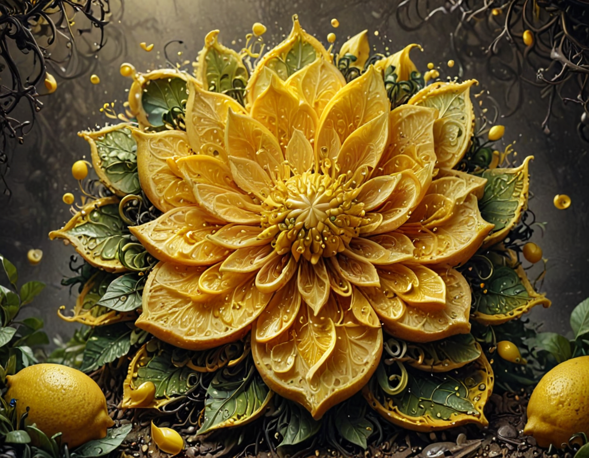 A bizarre lemon that has transformed into a flower-like structure, with petals made of lemon peel and a center filled with dark, swirling liquid, set in a twisted garden where nothing else grows