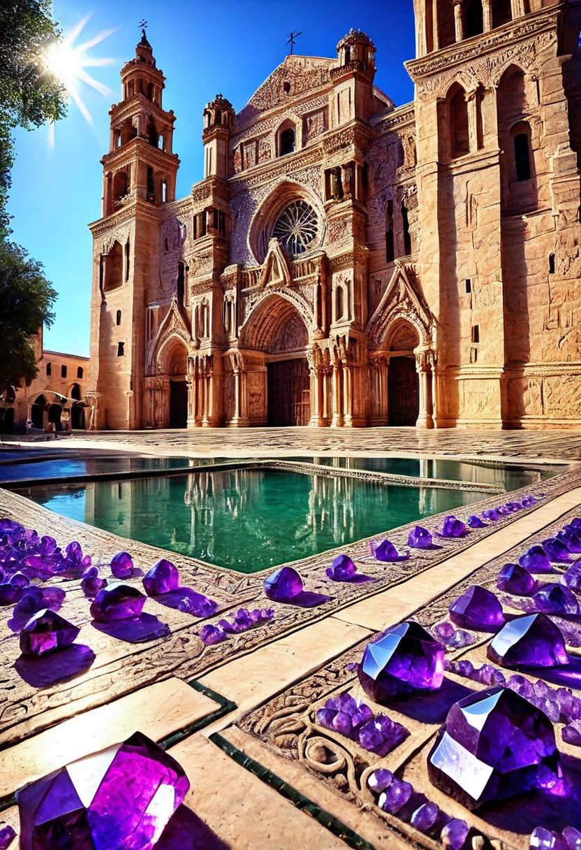 highly detailed, 4k, In the heart of San Antonio, Texas, stands a towering cathedral-the Alhambra hybrid. The intricate carvings and symbols that once stood as such are now visible in every detail, capturing the essence of this iconic landmark. The sun casts long shadows across the ground, HDR, illustrious quality, cinematic, High quality, beautiful detailed, flawless, perfect image, depth of field, photo realistic, made of sparkling amethyst crystals,atompunkstylesd15