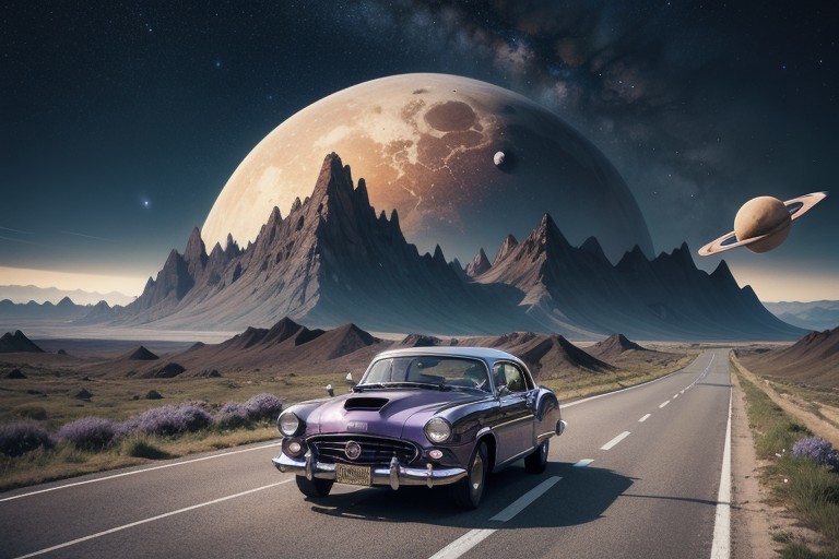 surreal illustration, a purple classic car on a infinite road, America 1950's, night sky full of stars and planets, large cake mountains in the background