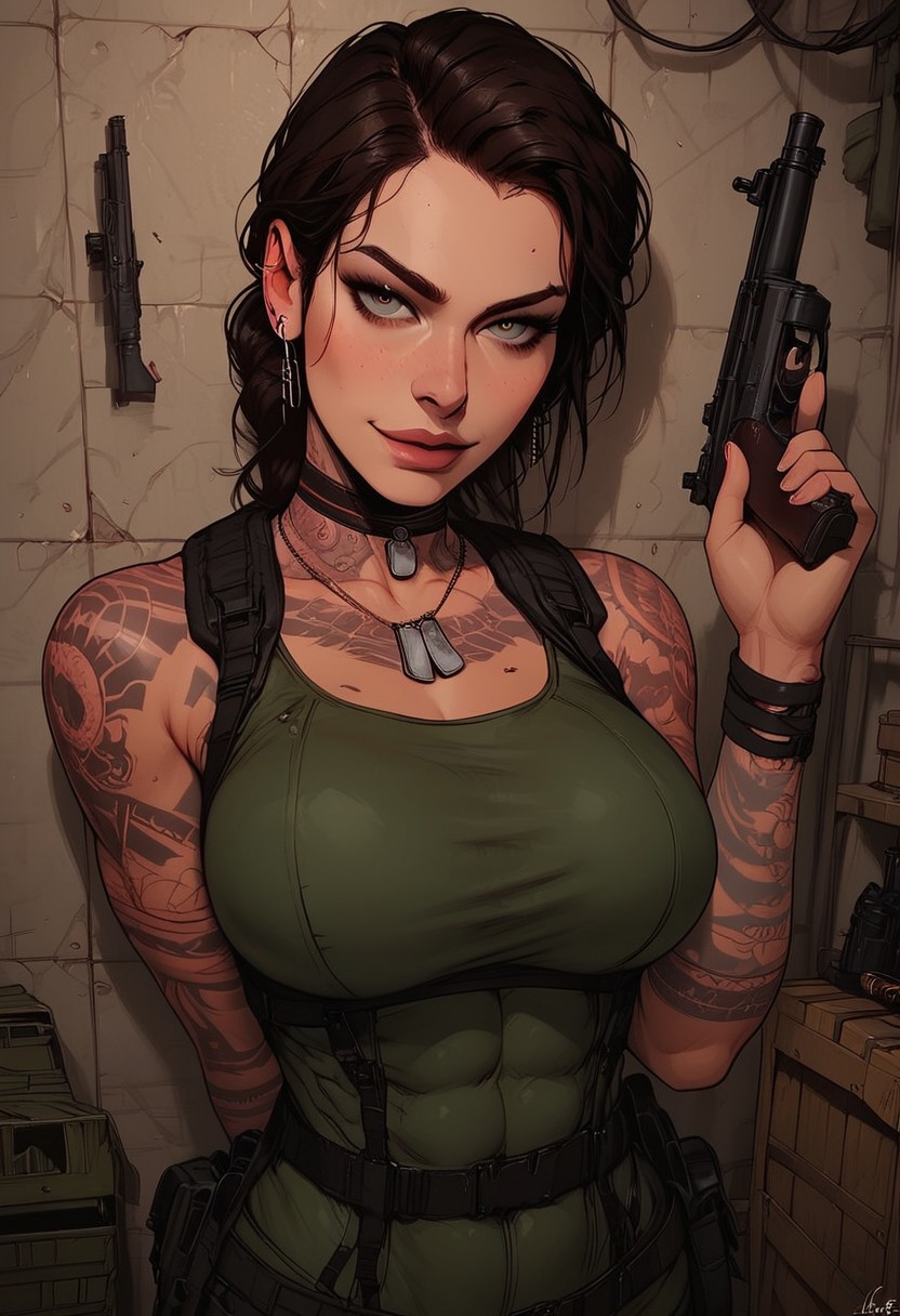 Score_9, Score8_up, Score_7_up, (((High Resolution, Best Quality))), 1girl, solo, toned arms, Covered in Tattoos, neck tattoos, hair tied up, revealing bodysuit, tactical, military gear, large breasts, choker, dog tags, ear piece, call of duty, seducing, seductive, flirty, tender, loving, playful, looking at viewer, smug, Leaning against wall, holding gun, inspecting gun, inside, Military, military base, military barracks, cots, crates, military boxes, guns, bullets, supplies,
