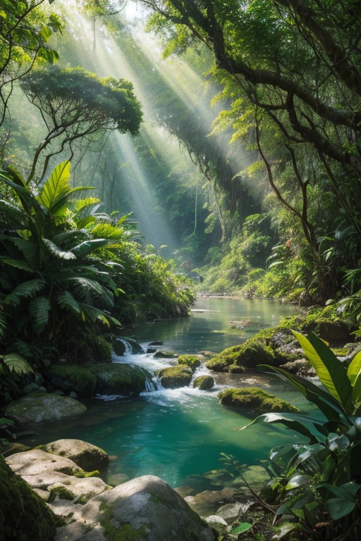 RAW photo, carribean island, delicate jungle grove, wild nature, picturesque scenery, enchanting sunrays, beautiful sky, majestic landscape, pristine vegetation, desolate atmosphere, morning island glade, blue water, jungle lake, jungle river, photorealistic, burds, masterpiece, 64k, UHD, ultra detailed, vivid colors, high quality, sharp focus