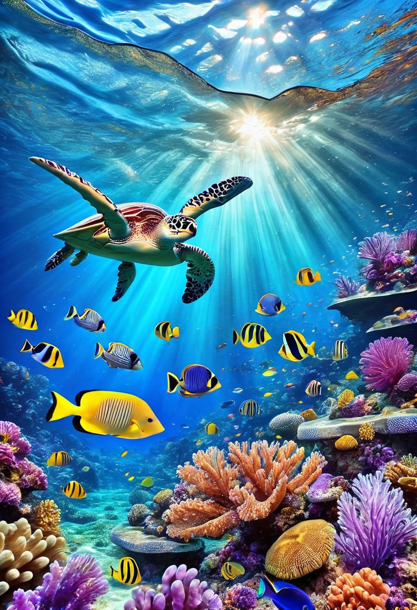 a majestic underwater scene teeming with vibrant marine life. The scene should feature a vast coral reef bursting with colorful corals and anemones. Include a diverse array of fish, such as schools of tropical fish, a graceful manta ray gliding through the water, and a playful sea turtle swimming nearby. Depict sunlight filtering through the surface, casting dappled light on the ocean floor. Add a sense of tranquility and wonder with a sunken shipwreck in the background, partially covered in barnacles and seaweed. Ensure the overall atmosphere is serene and captivating, highlighting the beauty and mystery of the underwater world. made of sparkling amethyst crystals,atompunkstylesd15