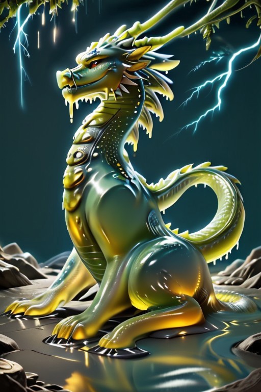 sl1m3d, slime-morph images, beautiful, fantasy, and complex, detailed portrait , CHINESE_dragon made of slime, squishy , squirm , swirl, slippery, slimy sensation Flying:1.4, roar:1.4, fiery colors, deep green, electric yellow, molten golden edges, beautiful, flash,bolt, lightning, thunder sea, night time, cloudy, masterpiece, photorealistic, highly detailed,artistic, floral beauty, natural elements, opulence, high resolution, digital art, visual aesthetics, contemporary design, vibrant colors, reflective surfaces, artistic composition, high contrast, elegant, intricate detailing, modern, futuristic.