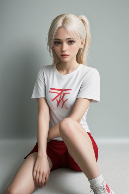 1girl, al3xa-001 masterpiece,best quality,amazing quality, blue eyes, white sports T-shirt, red sneakers, red sports shorts, blonde, two ponytails, red bows in hair, white background