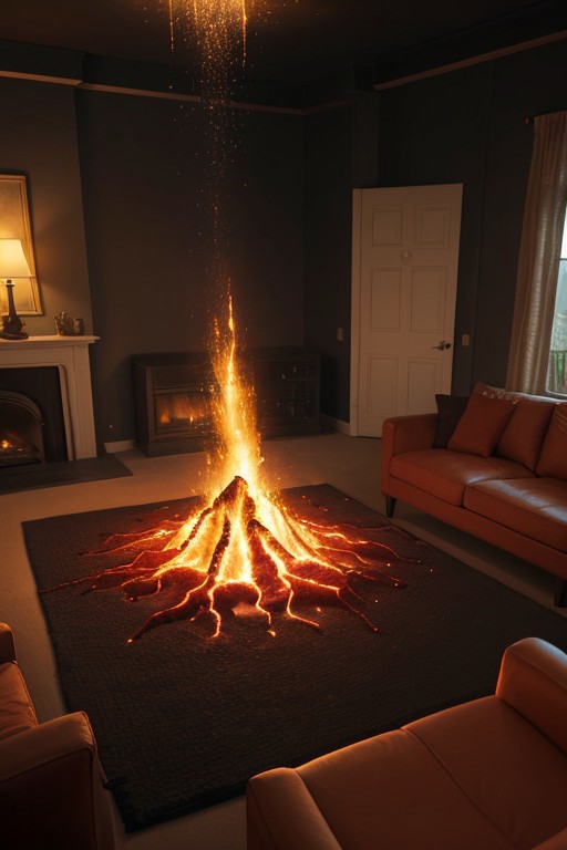 (aerial perspective),score_9,score_8_up,score_7_up,score_6_up, ,source photo,hyperrealistic,photorealism,realistic lighting,cinematic lighting,realistic shadows,featuring vibrant colors,masterpiece beautiful Unique,Award-winning photography,best clarity,dynamic lighting,8k resolution,extreme detail everywhere, A cozy living room features a soft sofa and a warm, textured rug. Above the couch hangs a dramatic painting of an erupting volcano, and suddenly, lava starts to spill out from the frame, flowing down onto the floor. Bright orange and red streams of molten rock cascade over the carpet, creating a vivid contrast with the room's serene decor. Bits of embers spark and float in the air, catching the soft light and igniting a few stray papers nearby. The heat emanating from the lava warps the air, and the surrounding furniture shimmers with a surreal, fiery glow that transforms the peaceful atmosphere into one of chaotic beauty. kisla