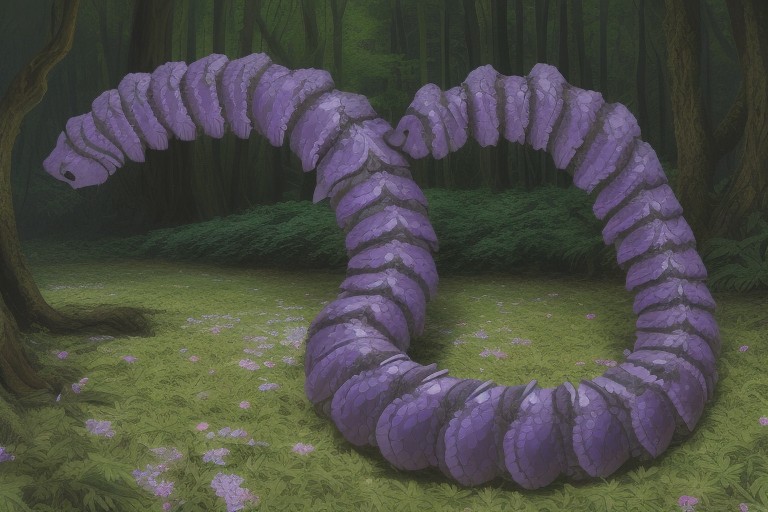 very detailed, masterpiece, centipede made of marijuana flowers in purple and blue tones, emerges from the ground in the middle of a leafy valley in spring bloom, the centipede is grotesque, it contours in an exaggerated way, a great contrast between the centipede and the environment that surrounds it.