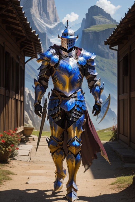 1boy, solo, solo focus, teenage, wear medium armor, amber color armor theme, outdoor, cape, beautiful scenery in the background, fantasy style, knight, armor, helmet, body straight to viewer, front body view, full body