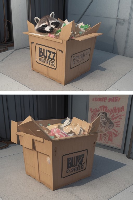 An image of a Raccoon in a dumpster diving for food, dumpster with lightning bolt symbol, text at the top center part of the image: 'I need Buzz buzz buzz!' in big letters , cute 3D anime style dgital artwork, 3D, render, anime, manga,
