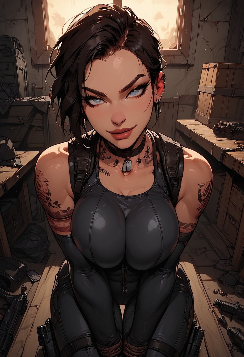 Score_9, Score8_up, Score_7_up, (((High Resolution, Best Quality))), 1girl, solo, toned arms, Covered in Tattoos, neck tattoos, hair tied up, Revealing bodysuit, bodysuit unzipped to crotch, tactical, military gear, large breasts, choker, dog tags, ear piece, seducing, seductive, flirty, tender, loving, playful, looking at viewer, smug, Sitting on chair, legs up on chair, arms resting on knees, arms on knees, inside, Military, military base, military barracks, cots, crates, military boxes, guns, bullets, supplies, armory,