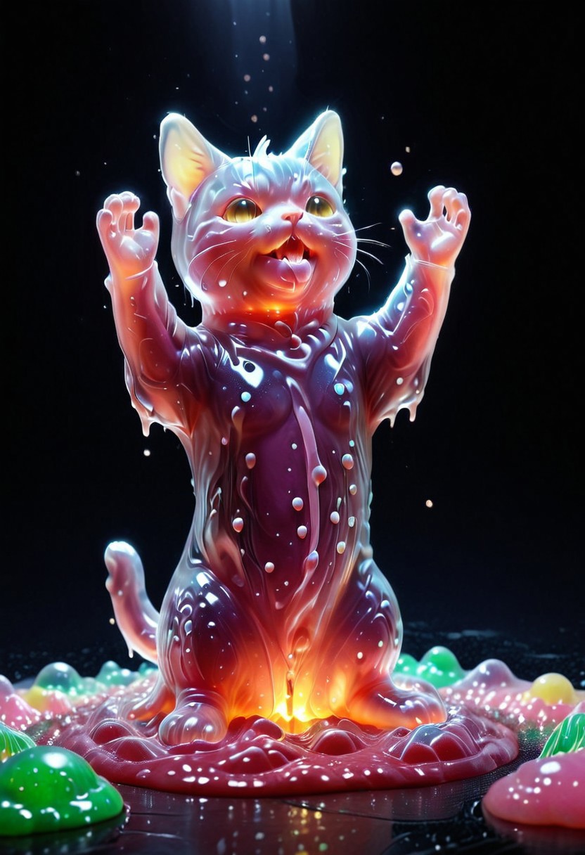 cute cat turn in slime, A light illuminates him in the darkness, raising his arms to the sky and shouting, Sl1m3d, slime-morph