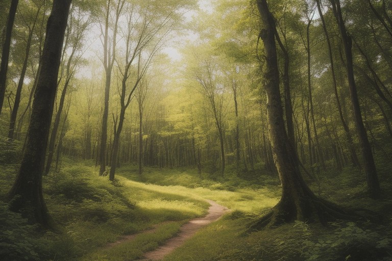 outdoors, spring forest, lush trees, wind, sunlight, landscape,