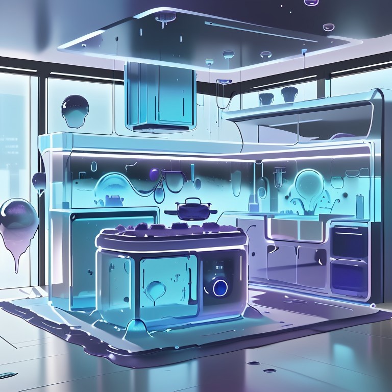 <lora:GelatinTech-20:1>, gelatintech , blue and purple, scifi, see-through, transparent, ((kitchen)), slime-morph