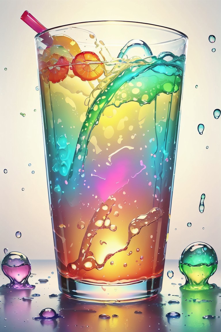 <lora:GelatinTech-20:0.8> gelatintech, (masterpiece, best quality, realistic, highly detailed:1.2), (splash screen, ad), see-through, transparent, (artistic drinking glass), (gelatin pieces:1.2), dense, rainbow gradient, colorful, condensation, colored liquid, slime-morph