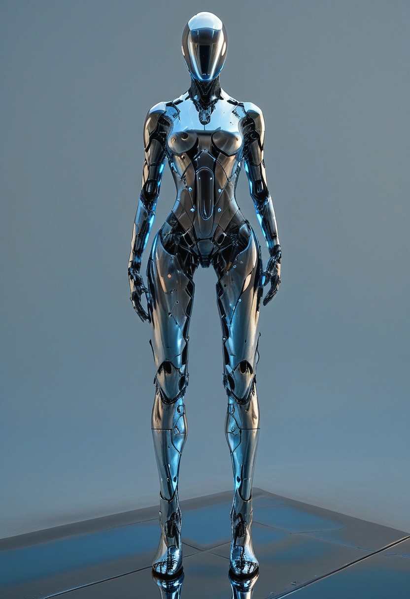 higly detailed, full length photo of a woman, skin made of iron, polished to a hig reflection, retrofuturistic style, the floor is made of polished iron , blue glow eminates from within her body, sunset noface, cyborg